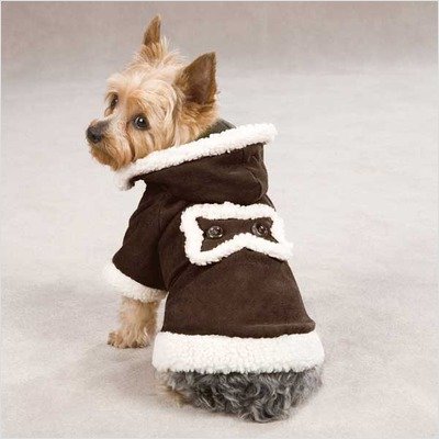 Winter Walks Have Never Looked So Good! Warm, cozy and always in fashion, this gorgeous faux suede coat boasts a fleece lining and a snuggly sherpa trim. A leash hole and snap on hood add convenience. Easy-fit style includes Velcro on the belly.